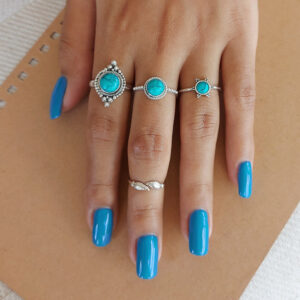 This beautiful 7mm circle turquoise stone is set in 925 sterling silver with a boho look and theme.