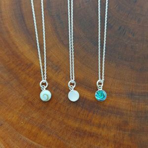 This 925 sterling silver necklace features a beautiful natural abalone shell disc pendant. There are also matching hoop charm earrings and this necklace is also available in white and shiva shell.