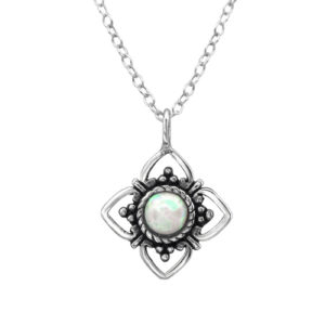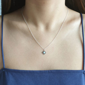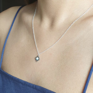 This is one of our most popular necklaces with this item featuring a faux fire opal in solid 925 sterling silver. It is also available in beautiful blue amazonite – which is perhaps our best selling necklace.