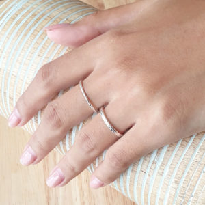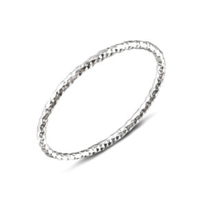 This is a slim 1/2mm stacker ring in solid 925 sterling silver with a diamond cut faceted surface which reflects light in multiple directions giving an almost sparkling affect.