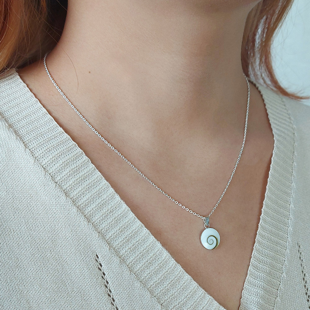Embrace the beauty of the ocean with our stunning Shiva Shell silver necklace. Crafted in sterling silver, this 45cm necklace features a unique 12mm circle pendant adorned with a mesmerizing shiva shell inset. Perfect for everyday wear, this piece is sure to turn heads and make a statement.
