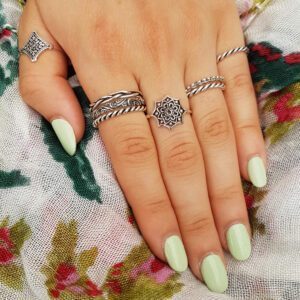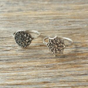 The Mandala ring is made of geometric symbols that represent both spiritual beliefs and the universe as a whole. Made of oxidised or darkened solid 925 sterling silver this ring has a form fitting design with the head sitting on the top of the finger to show off the feature pattern.