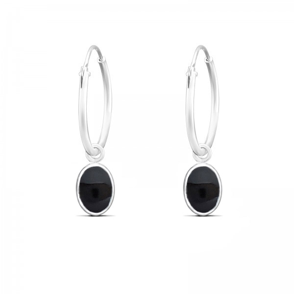 The beautiful 5mm x 7mm oval shaped black onyx gemstone charms sit on medium size 16mm x 1.2mm hoop earrings – all in solid 925 sterling silver.