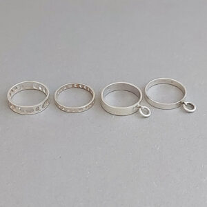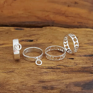 This is a 925 sterling silver ring which features the various phases of the moon, from crescent shape to full, as a cut out pattern around a 5mm band. There is also a slightly smaller version of this ring as various other studs, rings and necklaces in this moon theme.