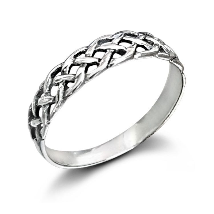 This classic Celtic pattern stacker or band ring is made of pure 925 sterling silver with that slightly aged look achieved through the antiquing process which is also known as oxidisation. The width is slightly thicker than a pure stacker ring but due to its flat type design makes it ideal in any combination of similar colour.