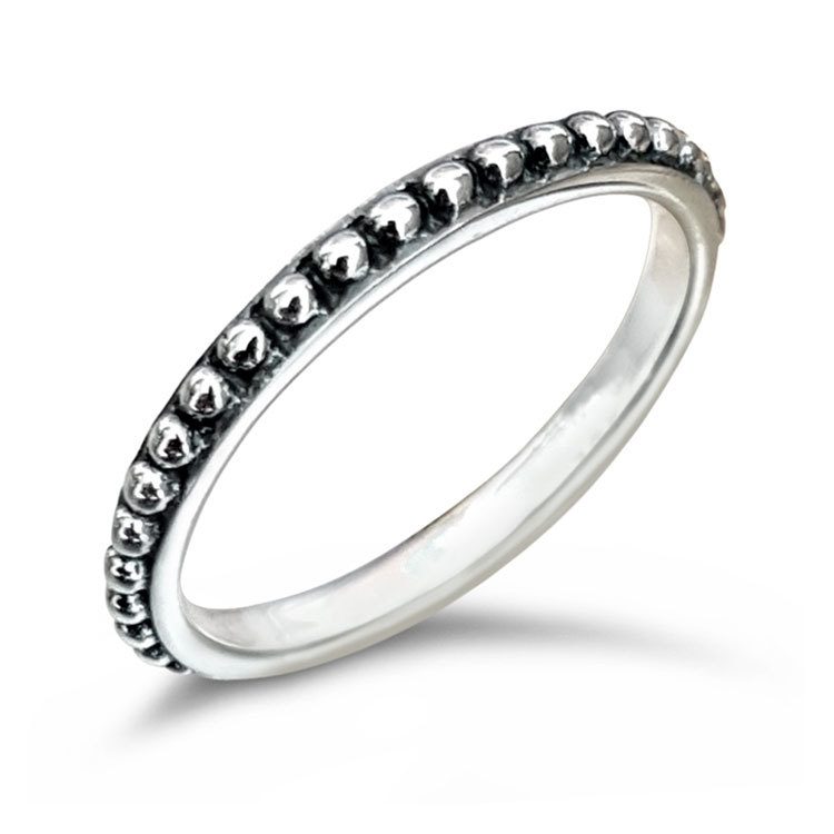 This is a 3mm wide 925 sterling silver band with distinctive beads that line the rim. In the boho theme the beaded design has been washed with a solution to oxidise a slightly darker colour in the non exposed regions. This ring stacks very well with similarly coloured oxidised rings.