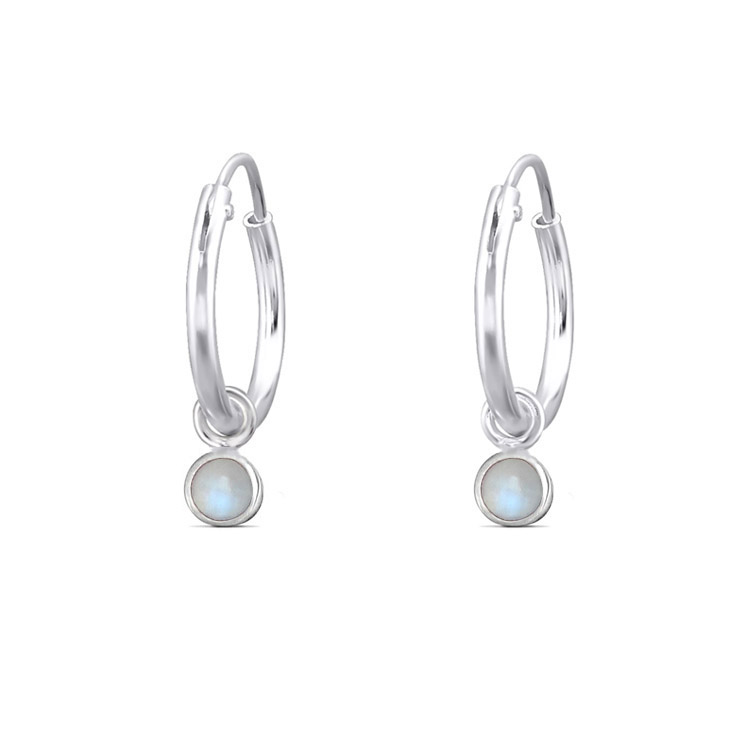 The beautiful small 3mm rainbow moonstone charms sit on standard size 12mm x 1.2mm hoop earrings – all in solid 925 sterling silver.