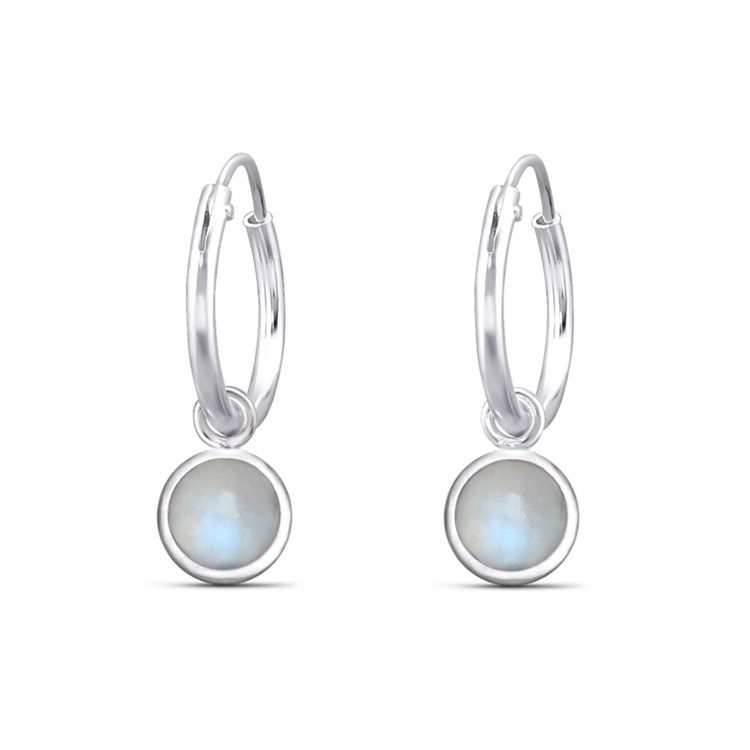 The beautiful 5mm rainbow moonstone circle charms sit on standard size 12mm x 1.2mm hoop earrings – all in solid 925 sterling silver.