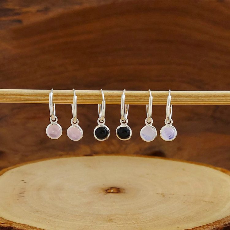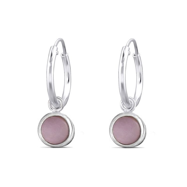 The beautiful 5mm rose quartz circle charms sit on standard size 12mm x 1.2mm hoop earrings – all in solid 925 sterling silver.