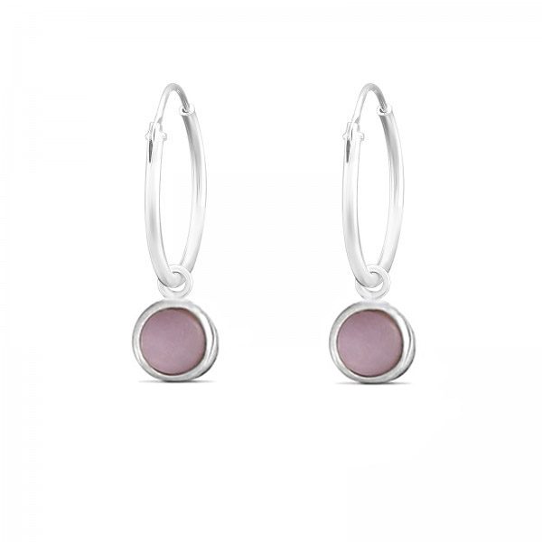 The beautiful 5mm rose quartz circle charms sit on medium size 16mm x 1.2mm hoop earrings – all in solid 925 sterling silver.