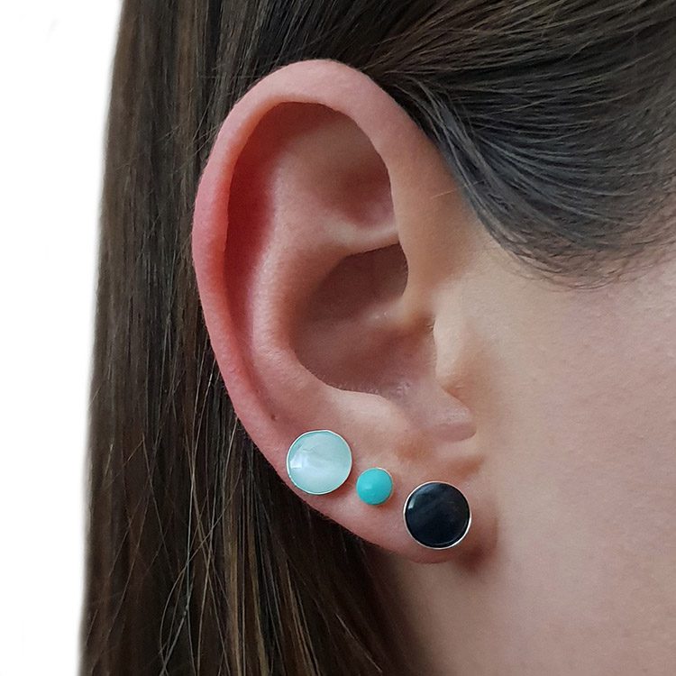 These sterling silver earrings are a classic round shape in a medium 7mm size with a black inset. There are similar shaped and sized earrings available in green, blue and plain silver.