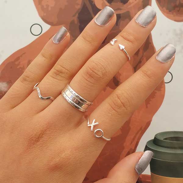 This midi is formed by wrapping an arrow around the finger so it forms a ring, with an open end so it is adjustable for size and can be moved along the hand to suit. It is a fine 2mm band yet quite robust and will sit on the mid part of the finger to compliment other features on the standard part of the fingers.