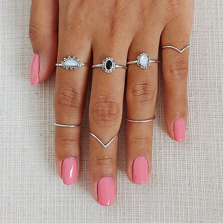 This is a white shell ring with a decorative pattern around the edge. This is one several similar rings available in this style and is also available with a black insert.