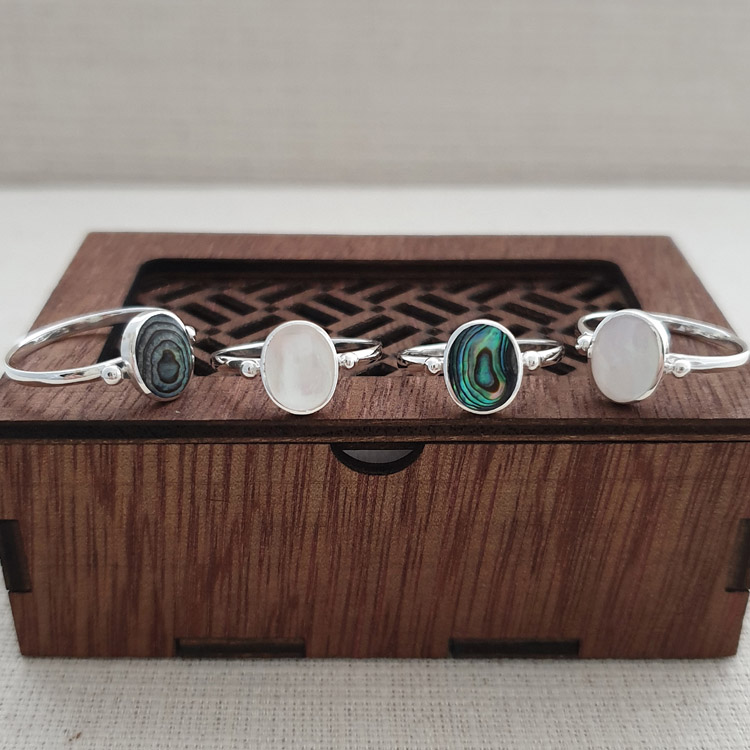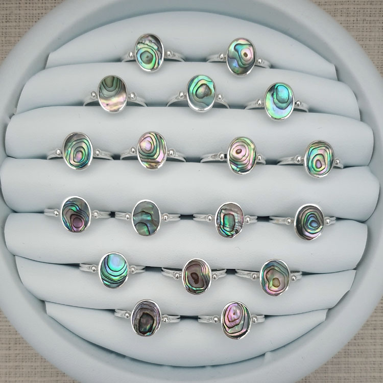 This is a medium sized 925 sterling silver ring in an oval shape with a natural abalone shell. Being a natural shell, every piece is different and truly unique. This is just 1 of a number of abalone rings and studs that Studio Jewellery currently has.