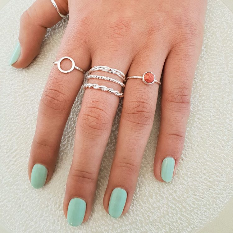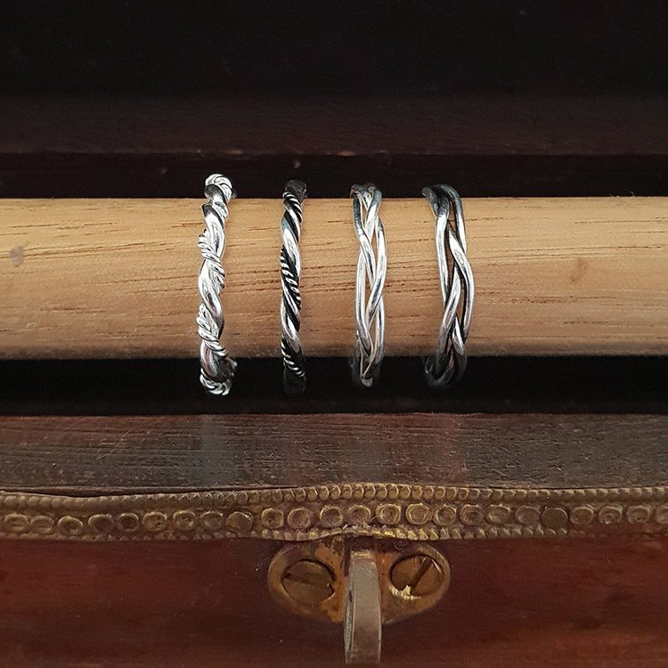 This is a classic birds nest stacker ring made of solid sterling silver and has a polished finish. The same ring is also available in a darkened oxidised finish. This stacker ring with its shinier finish is best with similarly coloured items in a combination.