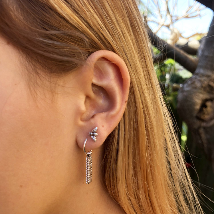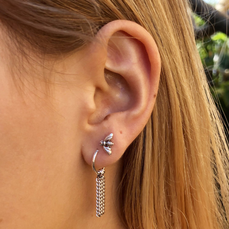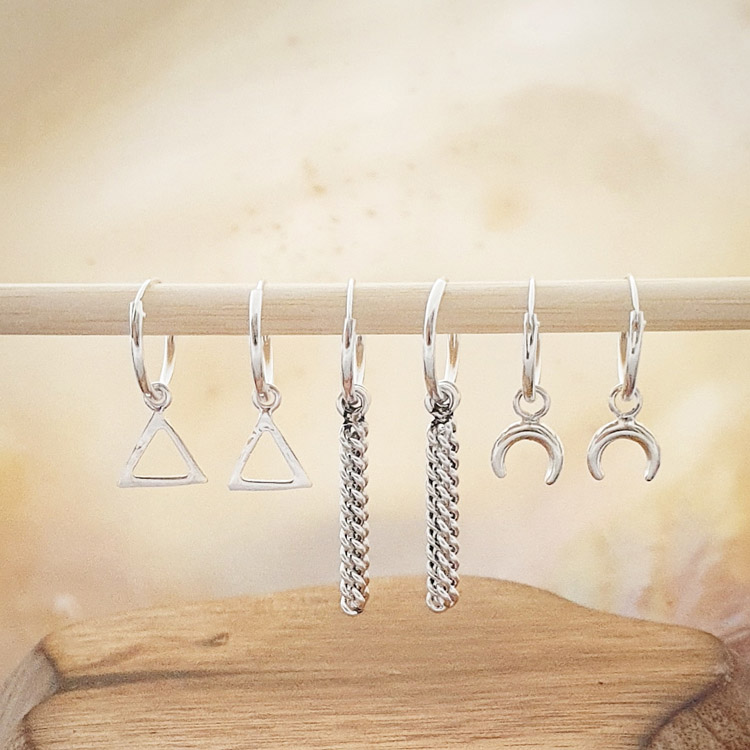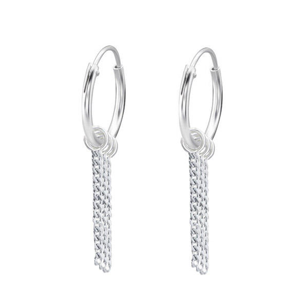 These hoop charm 925 sterling silver earrings feature 3 x dangling chains on each side. The hoop charm series has been very popular of late and Studio Jewellery has many on trend designs in this series.