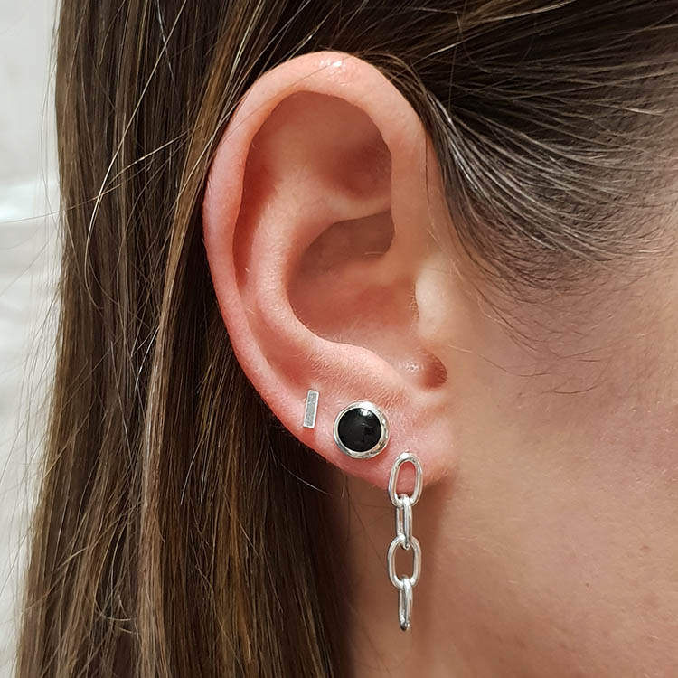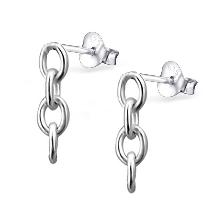 These sterling silver stud earring have the distinctive pattern of a 4 link chain and dangle freely from the lobe. The finish is polished and these stud earrings are very much on trend right now.