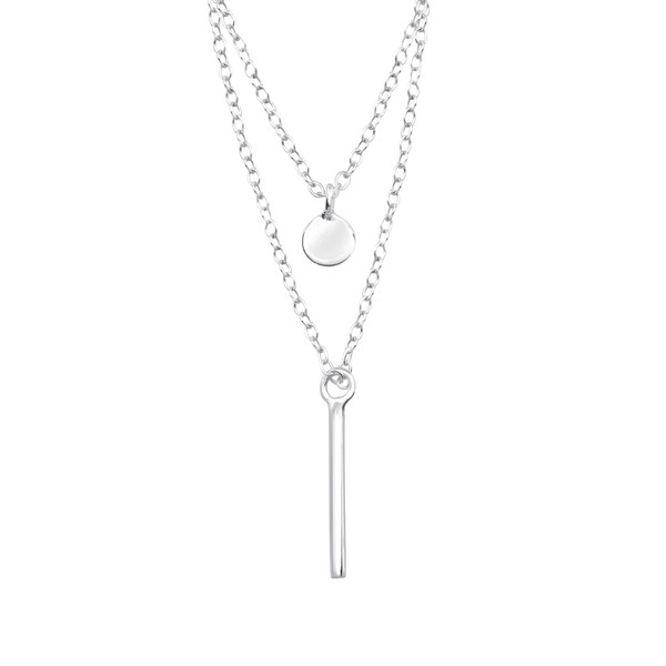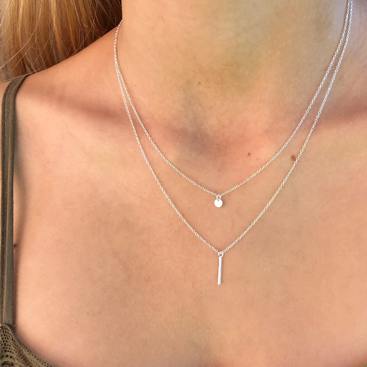 This is essentially 2 chains in the one necklace, on 1 chain there is a small disc or circle, while on the slightly longer chain there is a geometric bar. The appearance is of 2 layered necklaces.