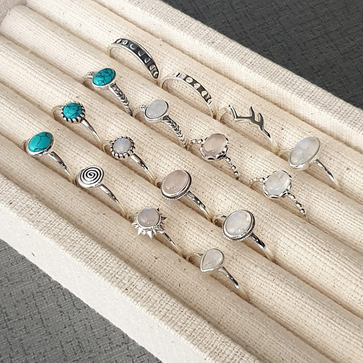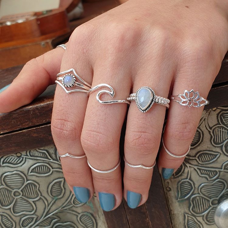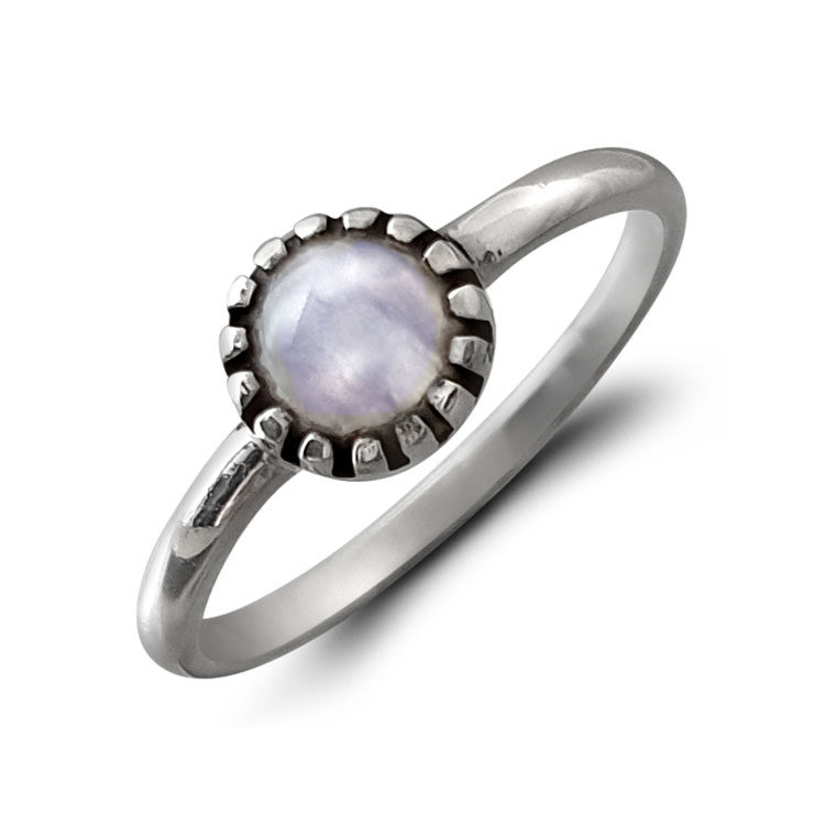 This is a decorative circle headed 925 sterling silver ring which features a rainbow moonstone gemstone which is predominantly white with some subtle blue fire flashes in certain light.