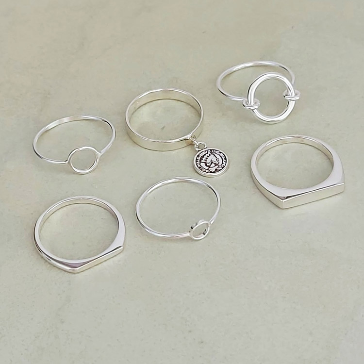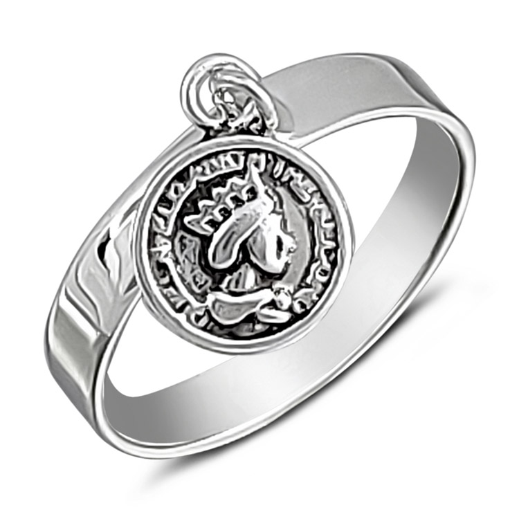This item is a 3mm sterling silver band with a distinctive coin and ringlet attached to the top which moves freely with any motion. This is a great item to be worn alone or as a stacker in a combination – simple yet very unique.