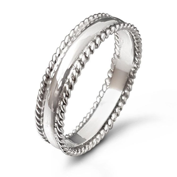 This band is about 4mm wide and comes with distinctive rope patterns down each side that have been slightly oxidised to give a little depth and interest to the design. This sterling silver ring combines with a lot of designs and hence is very versatile. Please note the pattern is cast and not woven strands like a lot of Rope patterns. This has been down for strength and longevity.
