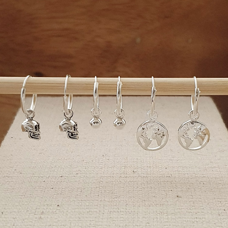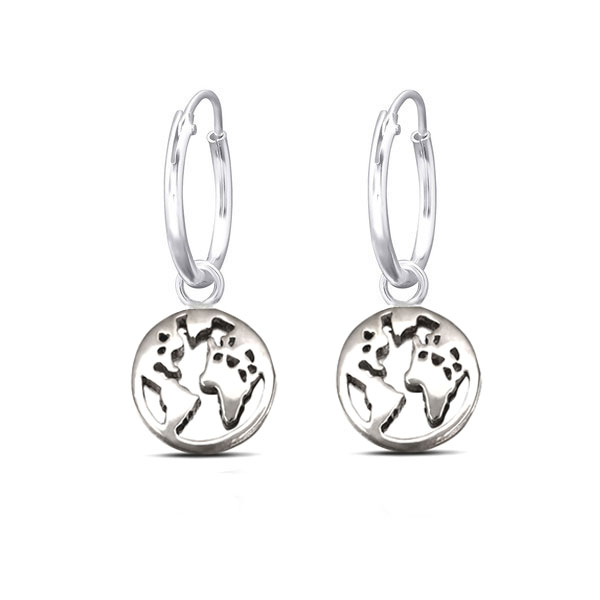 These hoop charm 925 sterling silver earring features a small earth pattern. The hoop charm series has been very popular of late and Studio Jewellery has many on trend designs in this series.