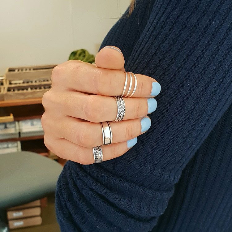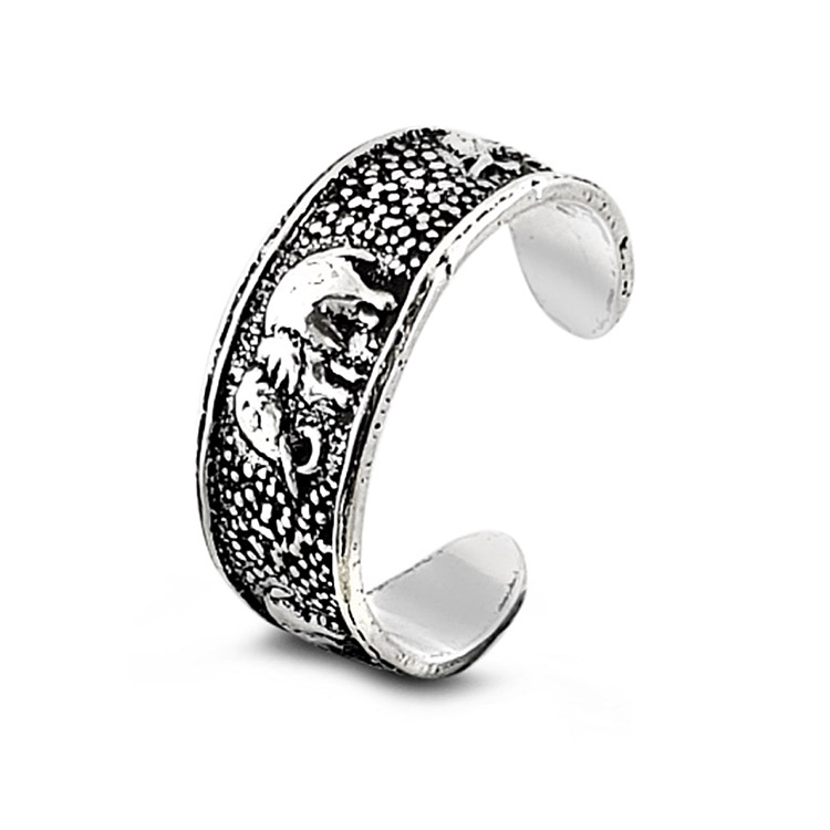 This sterling silver toe ring features elephants around the band, this ever popular animal is a symbol of peace and harmony, a symbol that virtually everybody can relate to. The sterling silver has been heavily darkened via the oxidisation process and the band is open so it can be adjusted to fit a variety of sizes. Studio Jewellery also has a number of other rings and earrings featuring Elephants.
