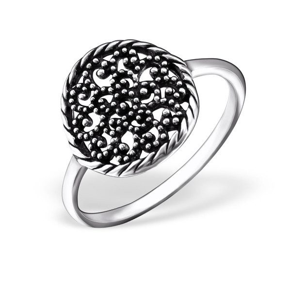 The Filigree Circle Ring in darkened 925 sterling silver features an intricate beaded style face which is medium to large in size and thus would be perfect on a middle or index finger. The shape of the head is curved to fit the natural shape of a finger and the band is relatively fine yet strong which is if course the style of today.