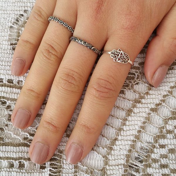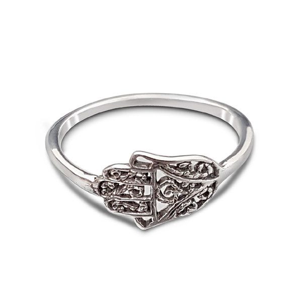 The Hamsa silver ring symbolises protection, happiness, luck, health, and good fortune for its’ owner. The design is form fitting in that it follows the curve of the finger and it has been “antiqued” or oxidised to give it depth and that old world look.