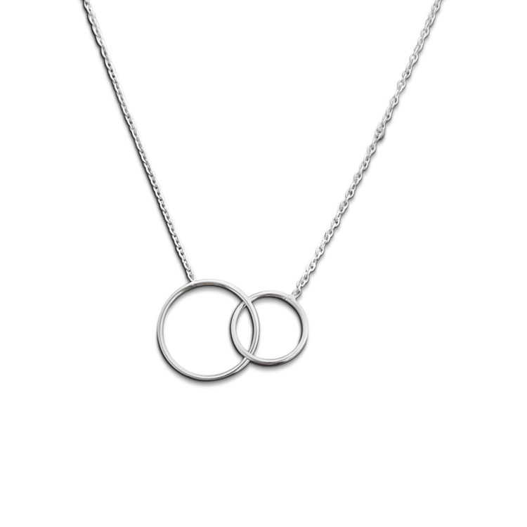This 925 sterling silver necklace features 2 interlocking circles, one being slightly smaller than the other. This is a true classic design and its beauty is in its simplicity.