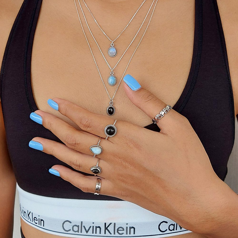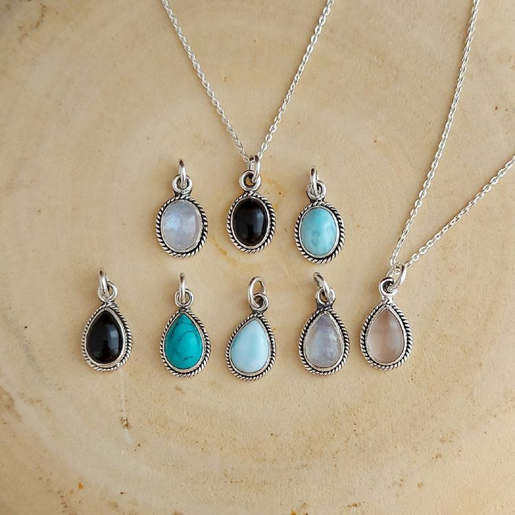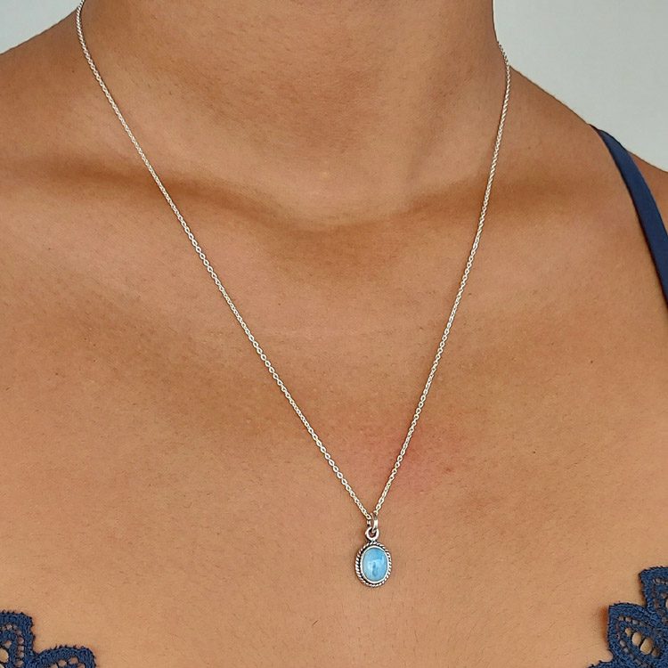This 925 sterling silver necklace features an oval shaped beautiful larimar stone with a rope edge pattern setting. It is also available in Moonstone and Onyx – which also have matching rings.