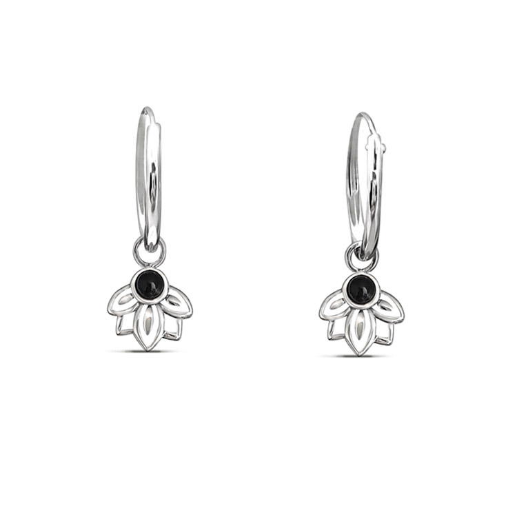 The standard size 12mm hoop earrings are decorated with a beautiful mandala pattern and black button inset – all in solid 925 sterling silver. This is one of many designs available in the hoop charm series and this design is also available with a white inset.