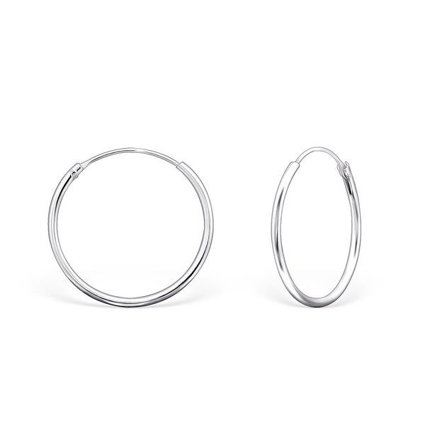 These medium slim sterling silver hoop earrings have a classic shape and continuous hoop clasp with the housing or tubing made from a hollow construction so they are very light and comfortable. The sizes vary from 20mm up to 40mm and are perfect for all occasions. Price is for 1 Pair of Earrings. There are also small and large hoops in this same slim width.