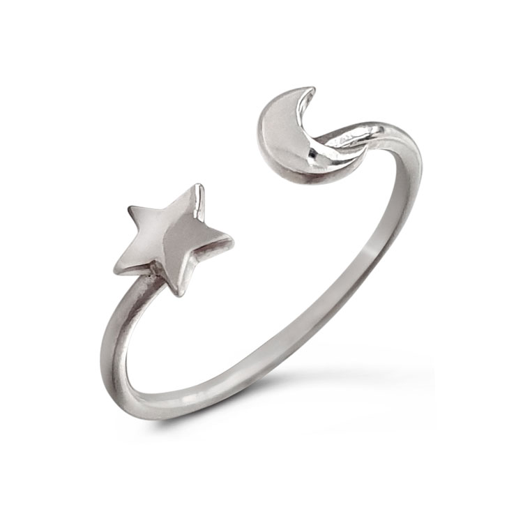 This item is an open ended banded and hence adjustable in size sterling silver ring with a star and moon on the face. This is one of many star, moon or celestially themed items here at Studio Jewellery including other rings, necklaces and stud earrings.