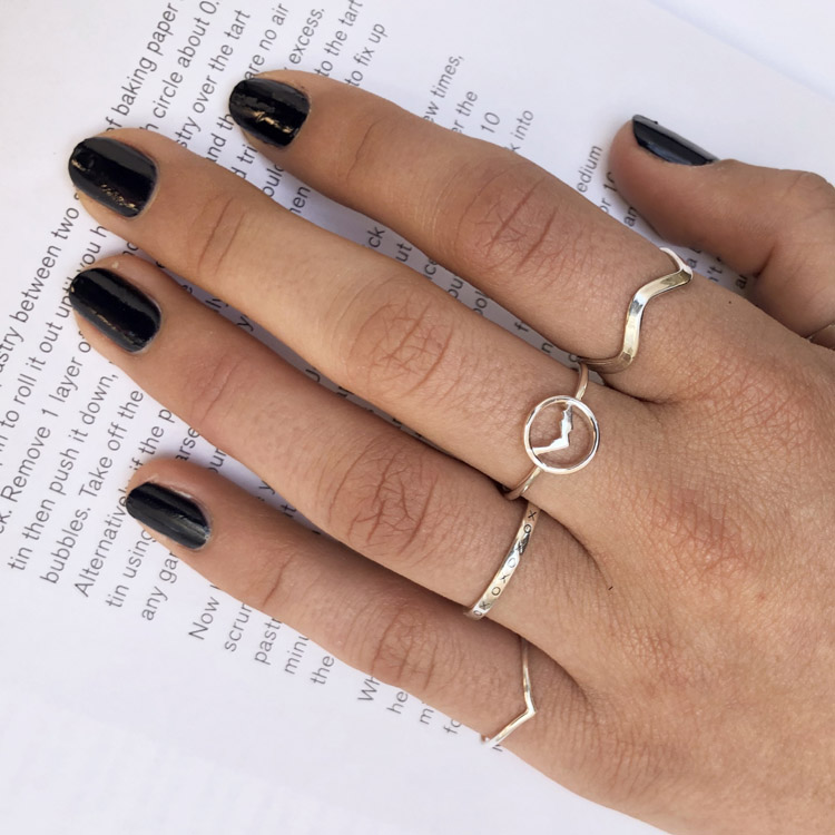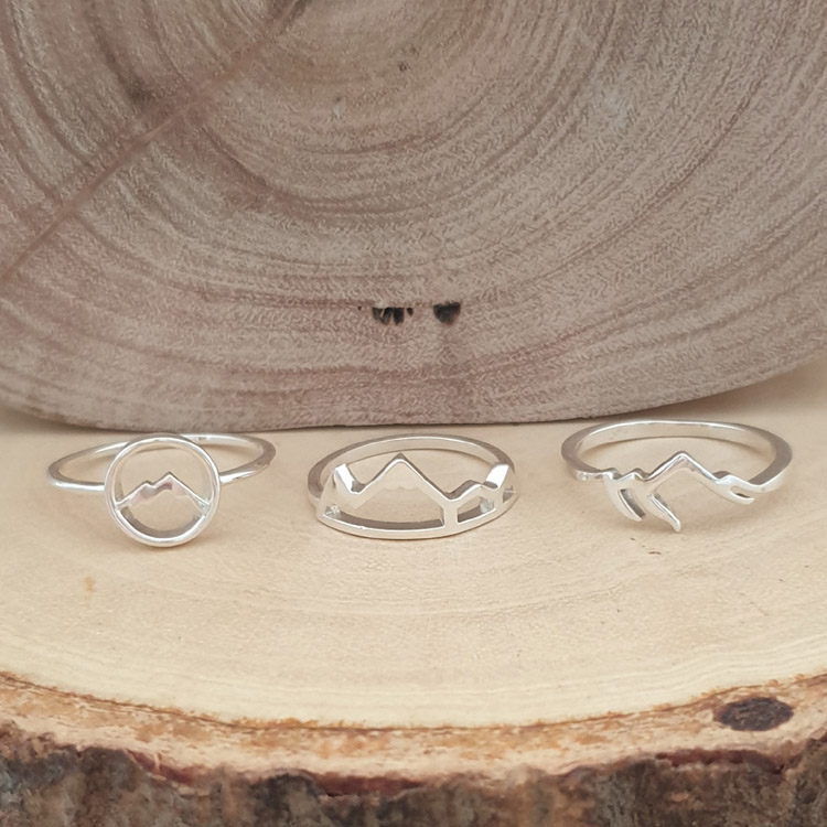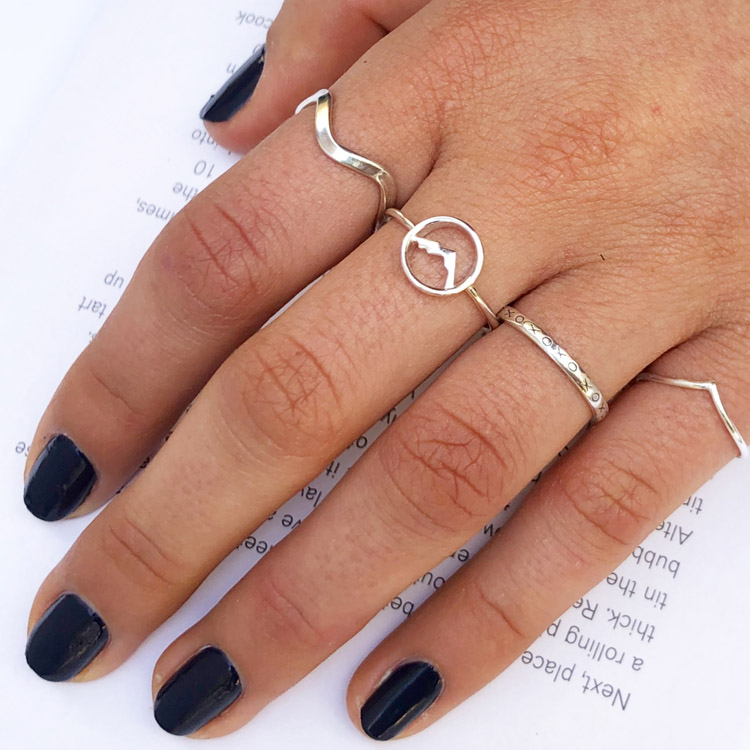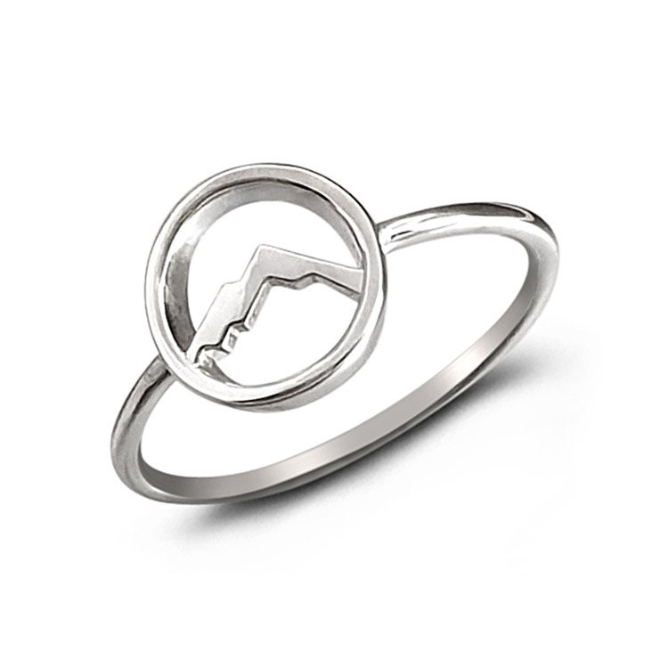 This circle 925 sterling silver ring features an outline of a mountain within the head. It is one of several mountain/travel related designs we currently have.