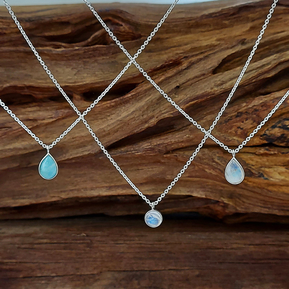 This 925 sterling silver necklace features a round rainbow moonstone stone with a fine edge pattern setting.