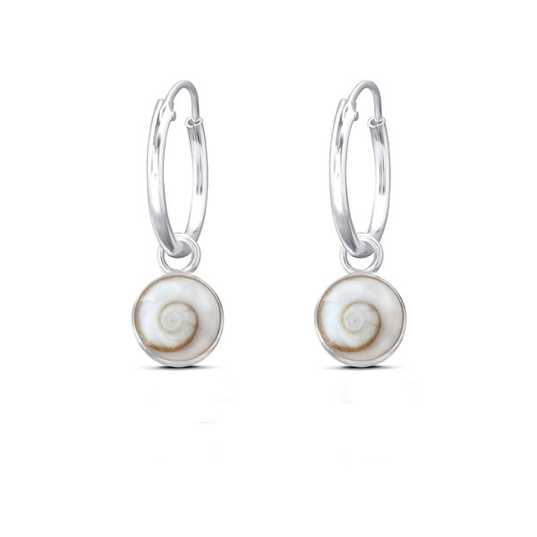 The standard size 12mm hoop earrings are decorated with shiva shell charms – all in solid 925 sterling silver. This is one of many designs available in the hoop charm series.