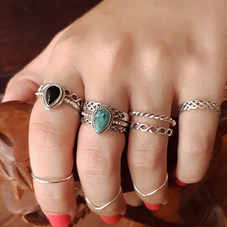 This classic Celtic pattern stacker or band ring is made of pure 925 sterling silver with that slightly aged look achieved through the antiquing process which is also known as oxidisation. The width is slightly thicker than a pure stacker ring but due to its flat type design makes it ideal in any combination of similar colour.