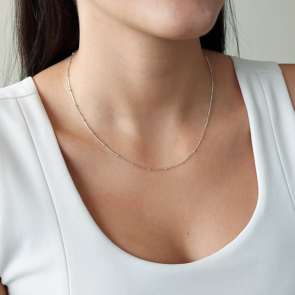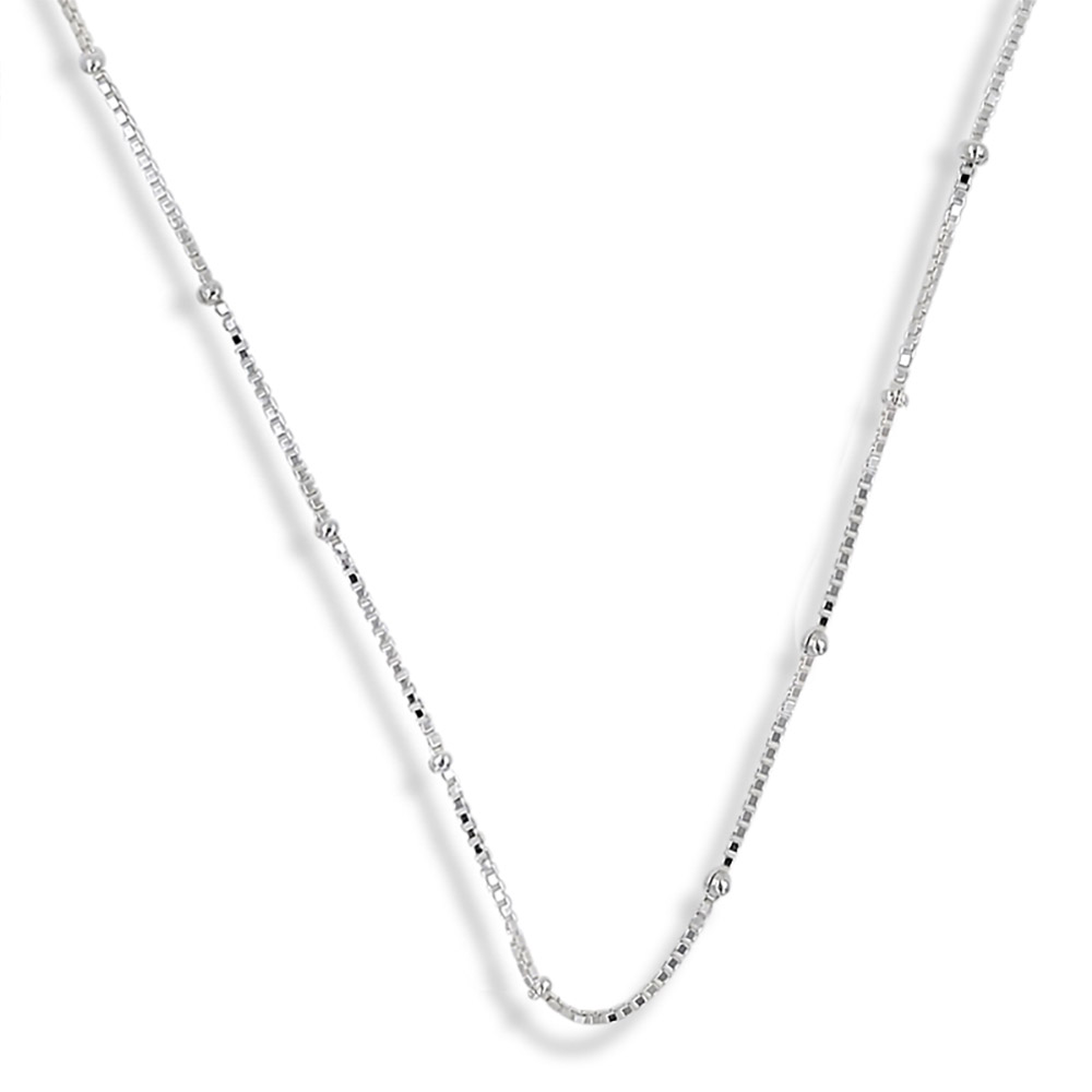Elevate your everyday look with our Silver Dot Box chain necklace, made of 925 Sterling silver. The standard 45 cm box chain features a unique bead detail that adds an extra touch of versatility to any outfit.