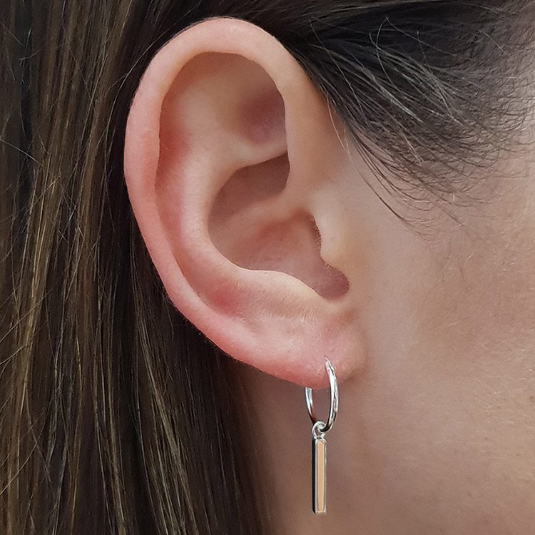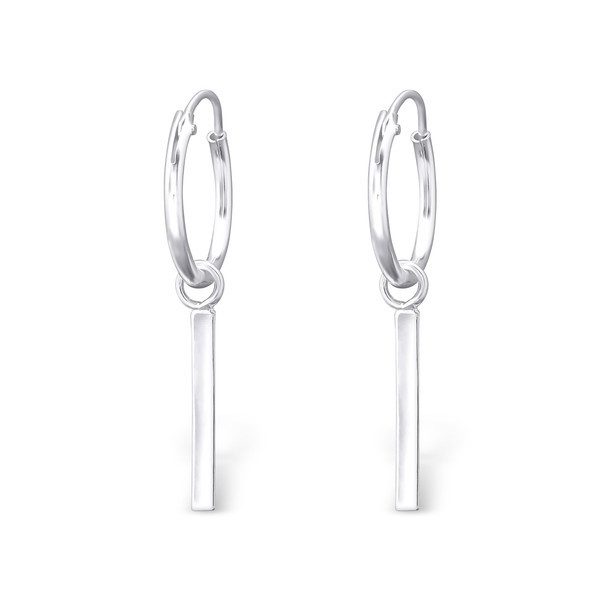These sterling silver hoop earrings have a distinctive slim bar tag which hangs from the ring. This model features a long slim bar tag while there is also a design with a wider tag available. Both of these designs are very popular into 2019. Price is for 1 Pair of Earrings.