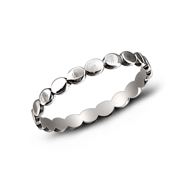 This sterling silver ring that has a distinctive flat circle pattern on a thin 2mm band and a polished plain silver surface.