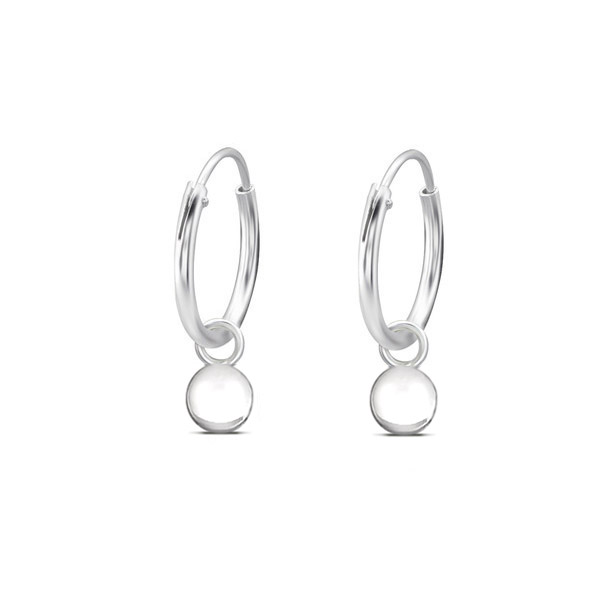 The standard size 12mm hoop earrings are decorated with a small 5mm disc charm – all in solid 925 sterling silver.