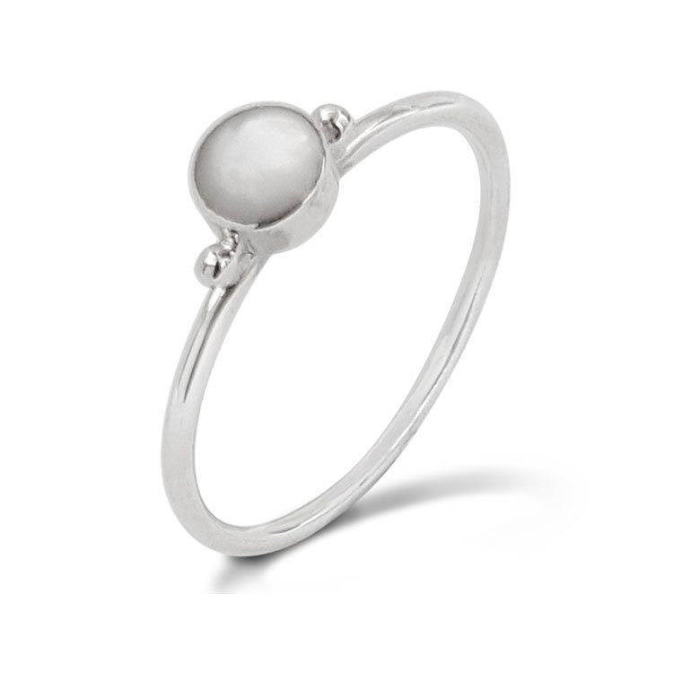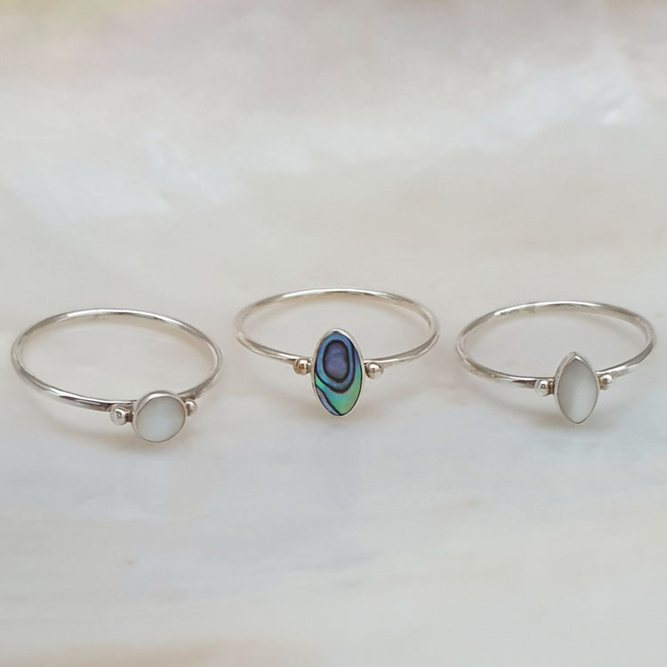 This is a fine sterling silver small circle ring with a bead on each side of the inset natural mother of pearl shell. The feature of this item is its simplicity and the iridescent white pearl colours add a lot of depth to its design and beauty.