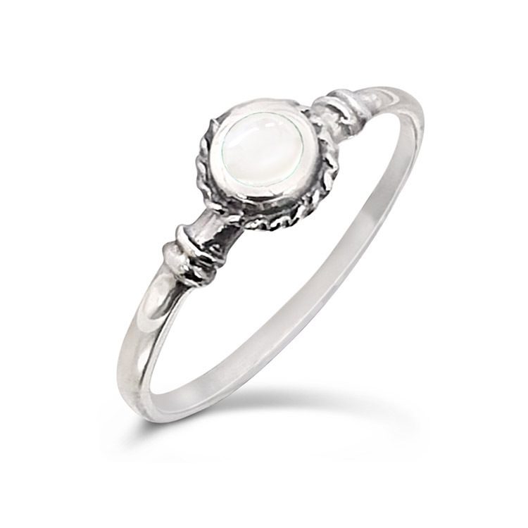 This is a fine sterling silver ring with a rope pattern on the head which holds the beautiful mother of pearl shell. This shimmering white natural shell is very popular now and features in a number of designs from Studio Jewellery. The setting is also available with an abalone shell as the feature.