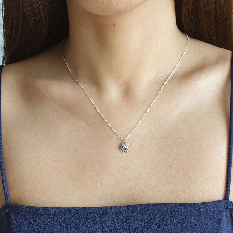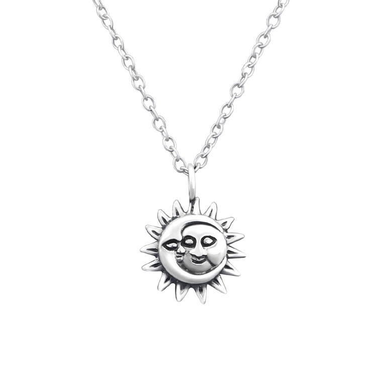 This is the necklace version of our current most popular smiling sun and moon design. It is solid 925 sterling silver and is also available in rings and stud earrings.