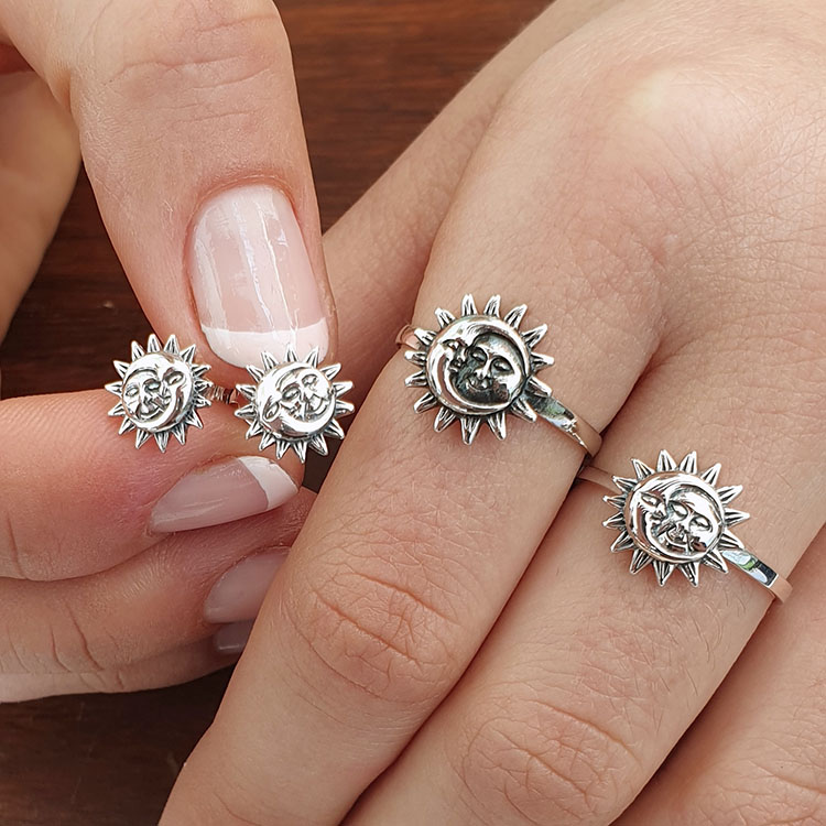 These are smiling Sun and Moon sterling silver stud earrings. This very popular design also has a matching ring available.