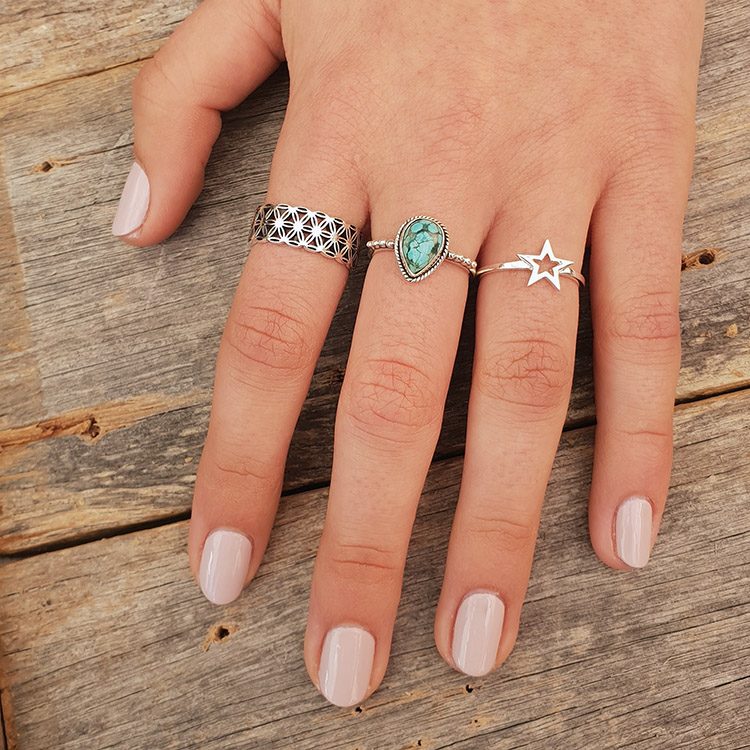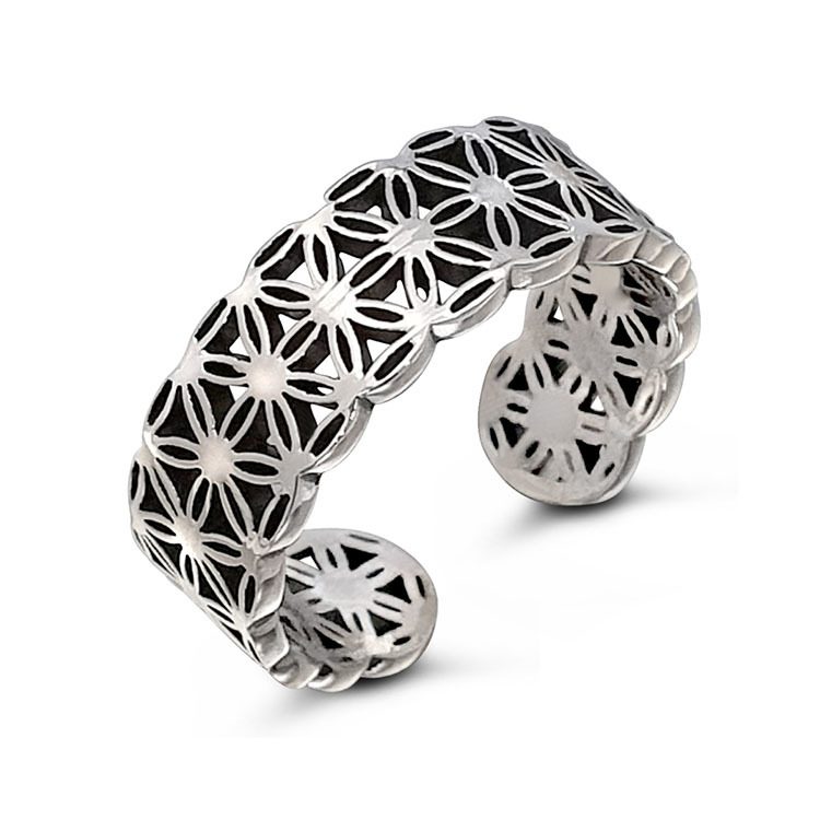 This band is opened ended and therefore can be adjusted up or down a size by opening or closing the gap. There is a subtle pattern around the band in a star or perhaps flower shape – the pattern depends upon ones own interpretation. It currently comes in just 1 size, a US – 7, the most common of all sizes for a lady in her early 20’s. It can only be adjusted to a size 6 or 8 as any further movement will cause an improper fit.