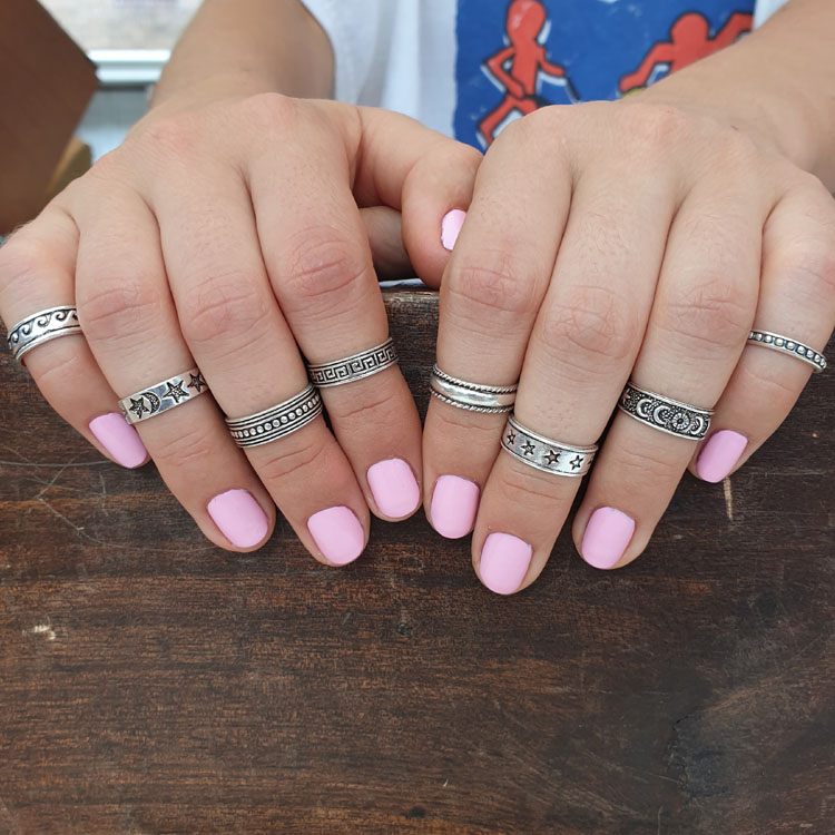 This is a 925 sterling silver mid finger or perhaps toe ring with a band of cut out stars as the feature pattern. There is also 2 thin lines that border the band and the size, like most midi rings is adjustable to a degree.