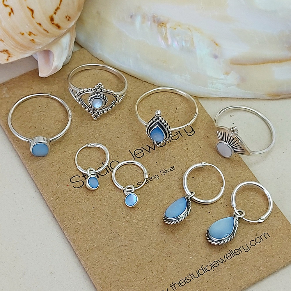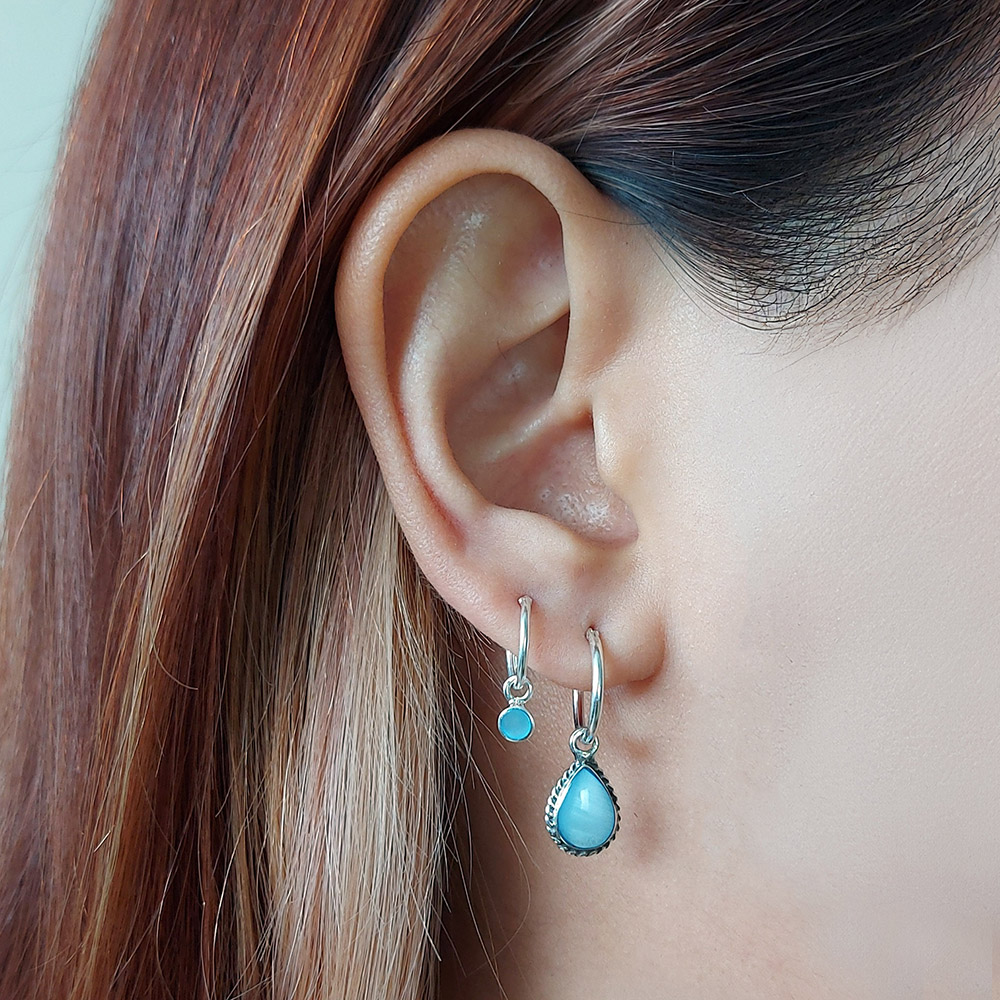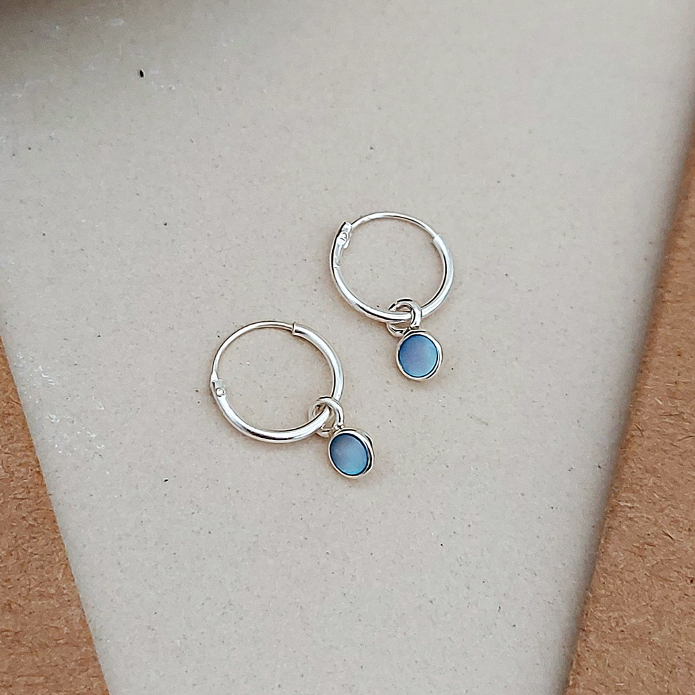 Enhance your everyday style with our charming Tiny Blue Shell hoop charm earrings. Sterling silver hoops adorned with a delicate blue shell disc, this earrings are perfect for any jewellery lover seeking a subtle yet stylish addition to their collection. Perfect for adding a pop of color and texture to any outfit, this earrings are sure to become a staple in your accessory rotation.
