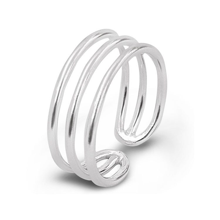 This is a distinctive looking triple fine banded sterling silver ring that gives the appearance of 3 separate simple stackers however they are all brought together at the back but not fully joined so it is adjustable in size. The added advantage of this ring is the simple bands all stay together in place where as if individual items are worn they would need constant adjusting.
